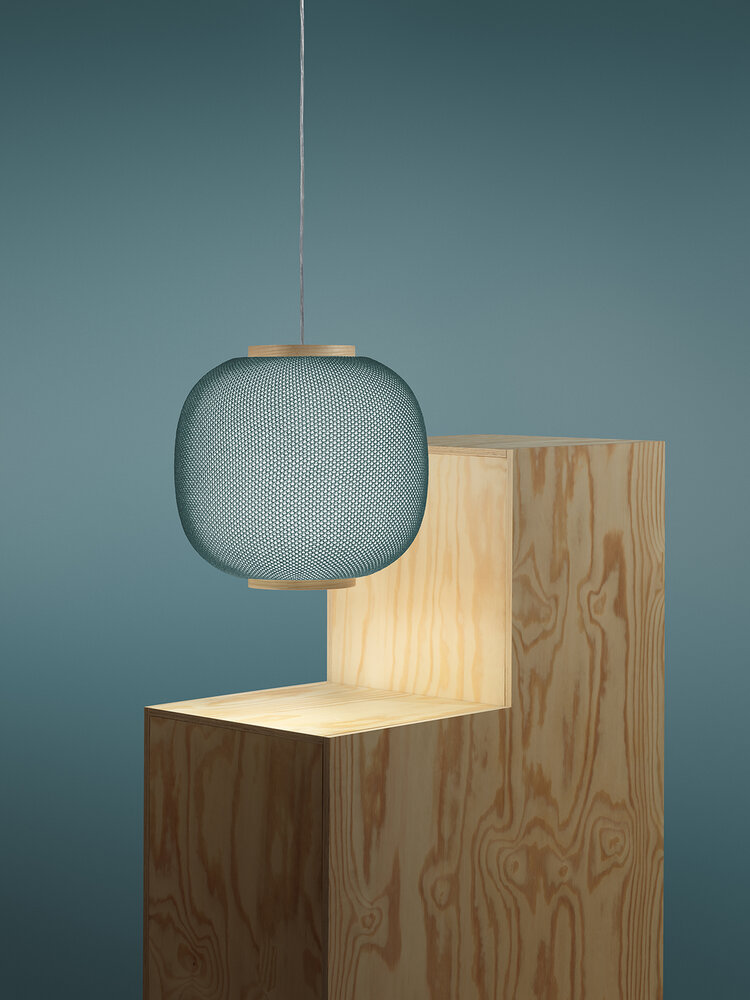 Finish Shade cover in 3D woven polyester fabric from Camira in white, black or petroleum. Inner shade in opal acrylic. Wooden ash rings